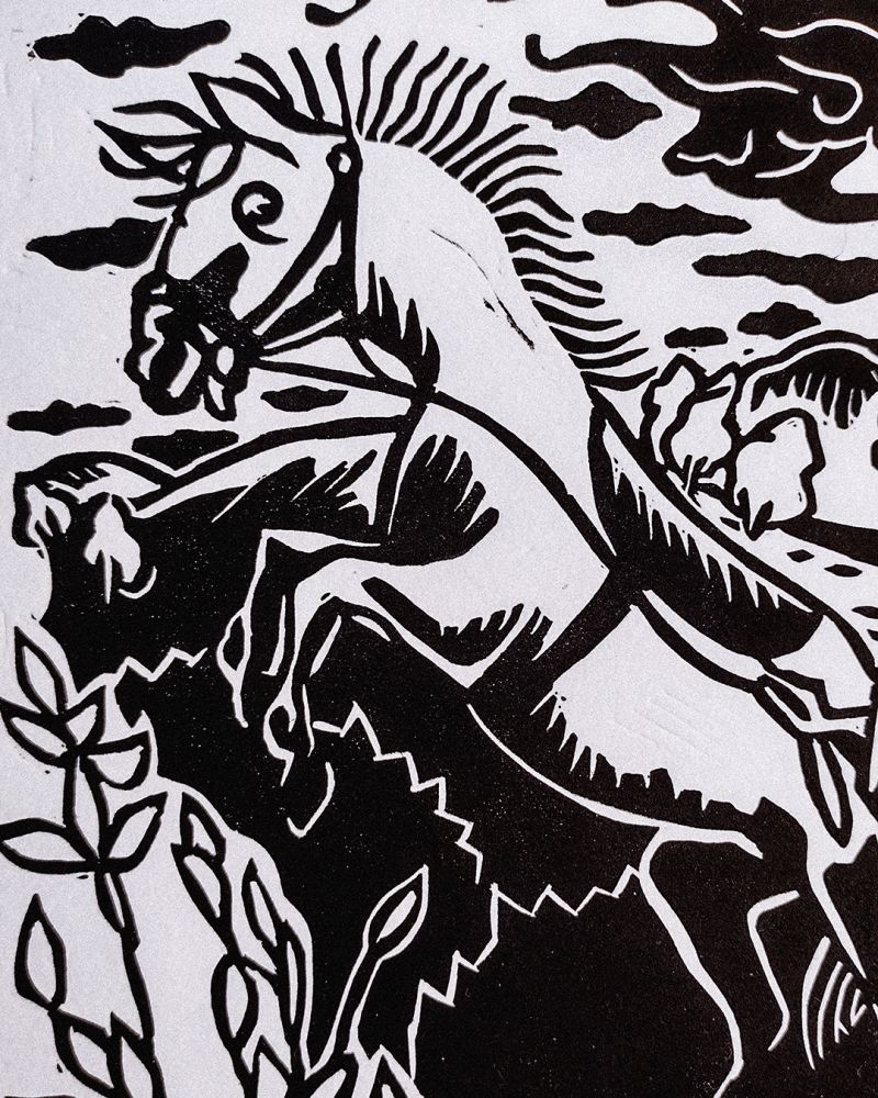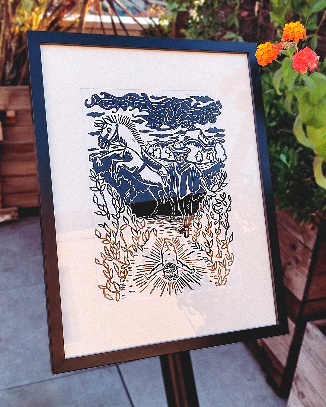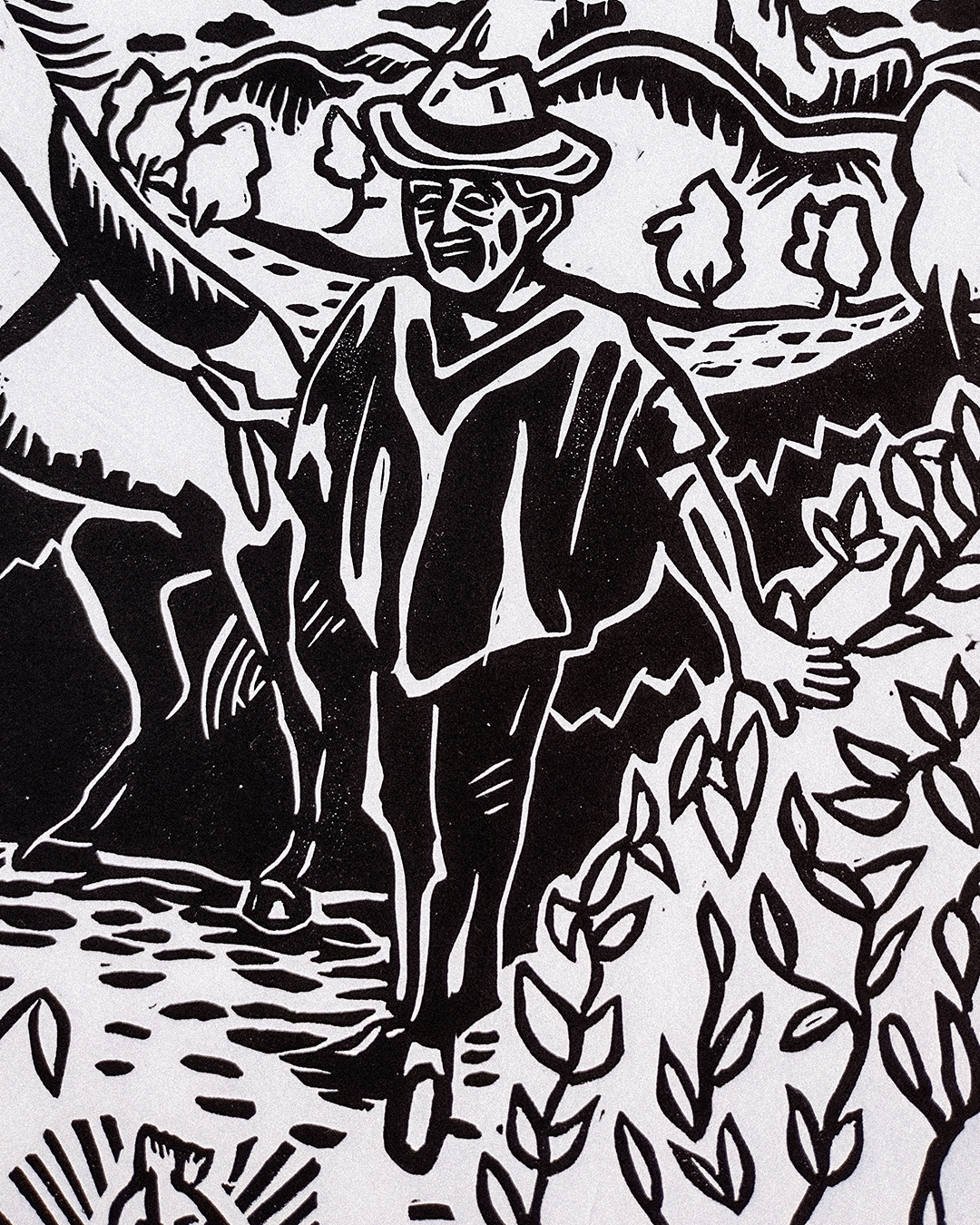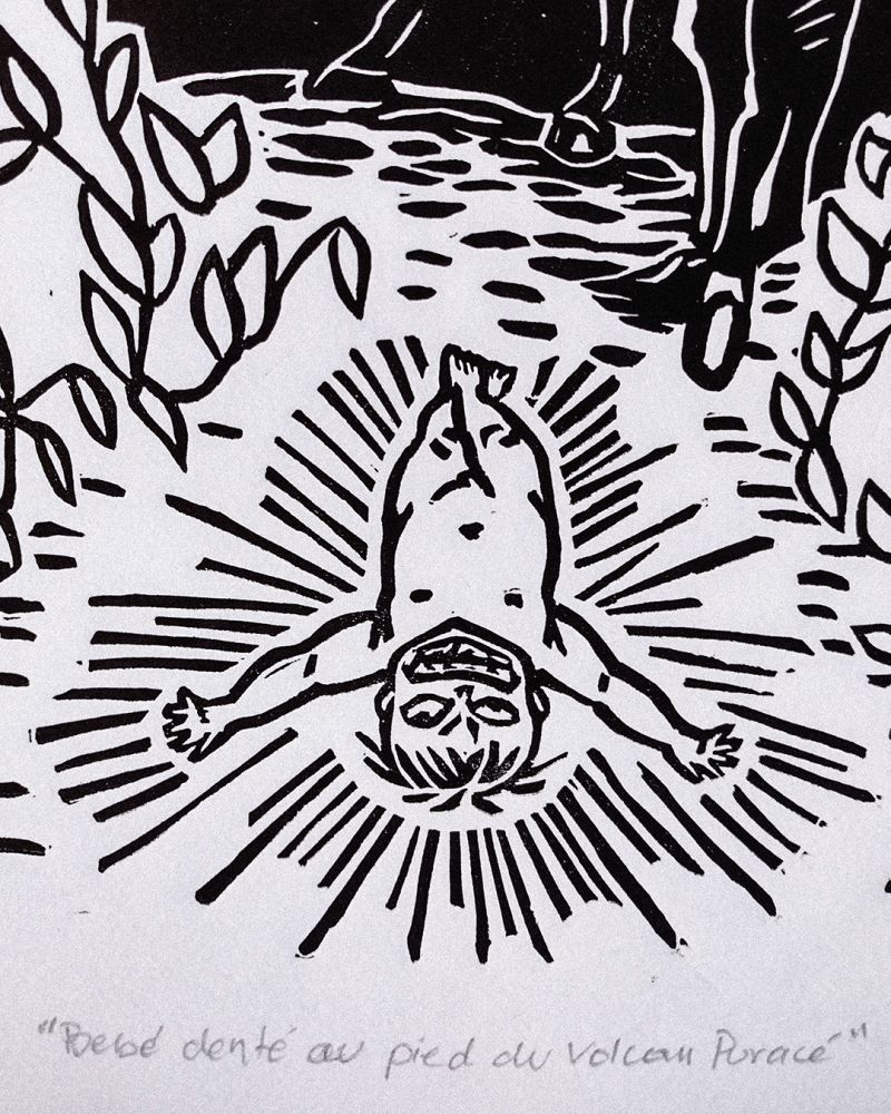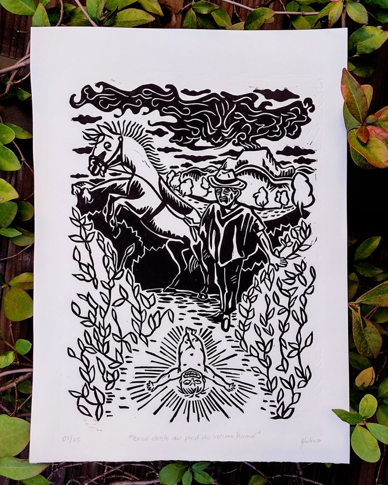 Estampe imprimée à la main à partir d’une gravure sur linoléum. Bebé denté au pied du volcan Puracé fait partie d’une série d’estampes sur la tradition orale des régions de la Colombie, racontés au sein des familles et entendus surtout à la campagne.